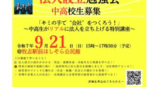 中高生のみなさんへ 【無料】9/21中高生のための法人設立勉強会キックオフ! 主催 おもろまちSBP 協力 北那覇法人会青年部 「キミの手で“会社”をつくろう!」〜中高生がリアルに法人を立ち上げる特別講座〜学校では絶対に学べない!経営の第一歩「法人... 2025.09.02 中高生のみなさんへ